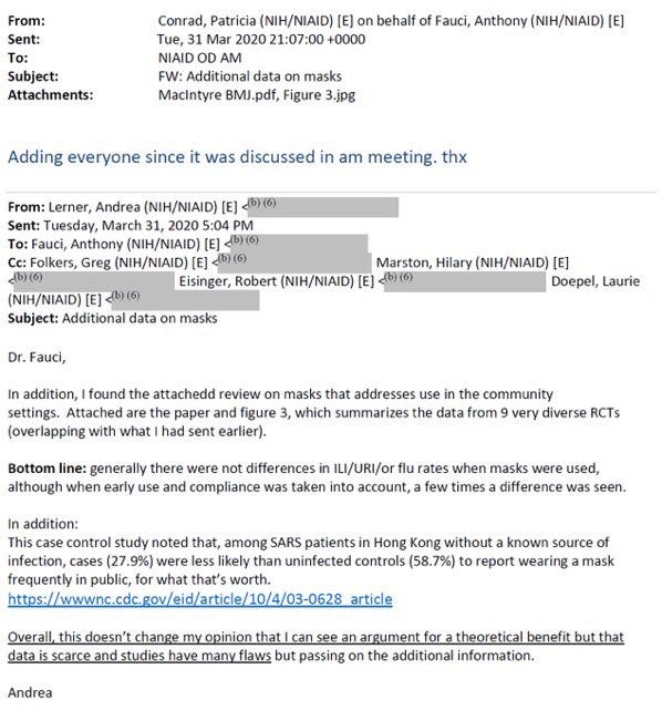Emails show that leading officials at NIH, including Fauci, knew the best data indicated no benefit from masks.