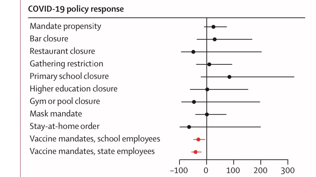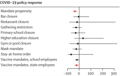 A paper from last year in the Lancet showed no impact of lockdowns, school closures, mask mandates, or stay-at-home orders on deaths from COVID19 in America, instead finding only downsides to these policies.