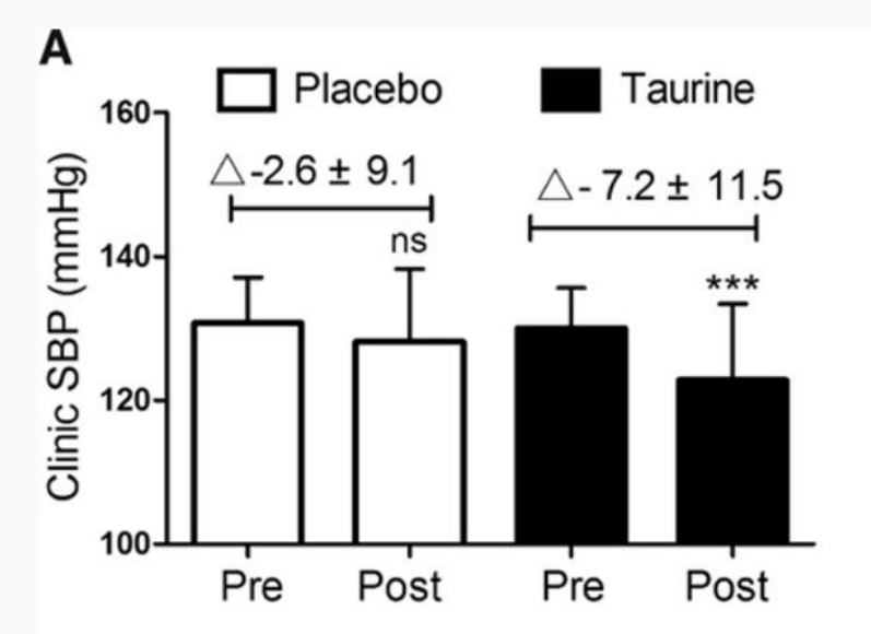 A meta-analysis including 188 subjects showed an improvement in both systolic and diastolic blood pressures after taurine supplementation compared to placebo. (Link.)