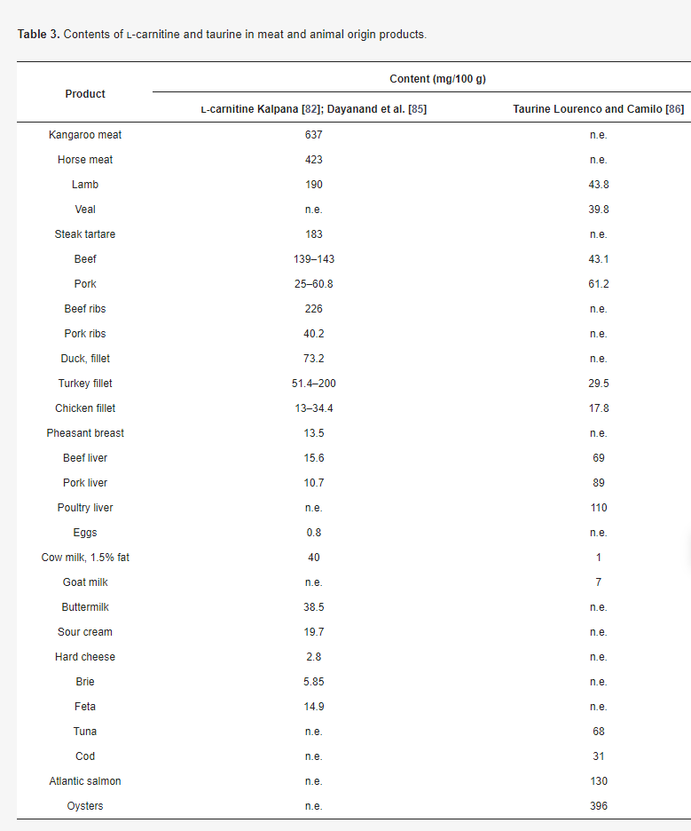 Taurine is found only in meat (50-100 mg/100g). The highest concentrations are found in oysters (400 mg/100g). (Link.)