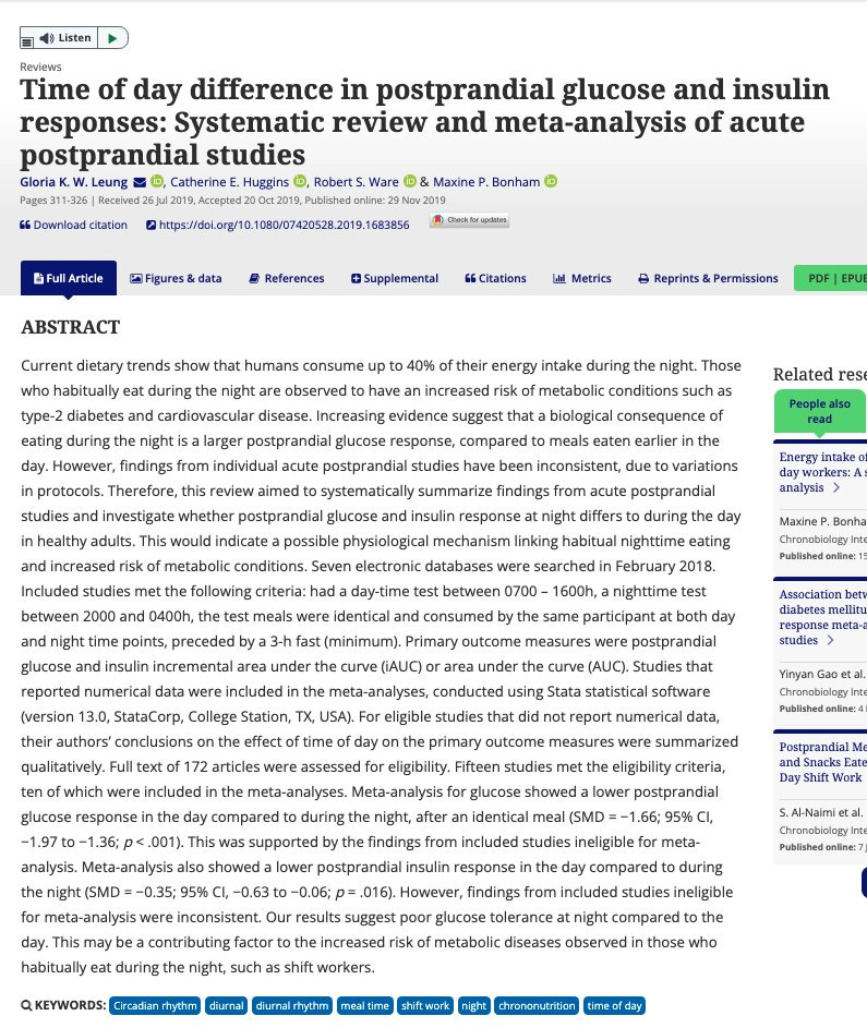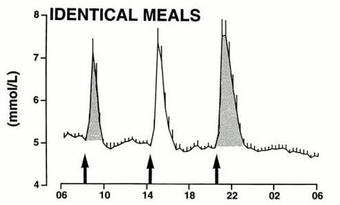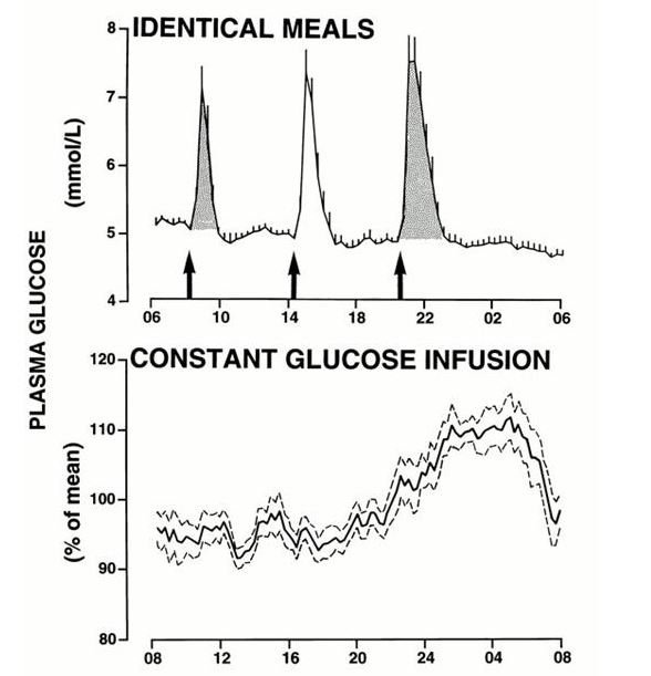 Yet other study types show something similar. Well-controlled metabolic ward studies, providing a test meal earlier vs. later in the day, showed an acute deterioration in metabolic function for the meal given later in the day: